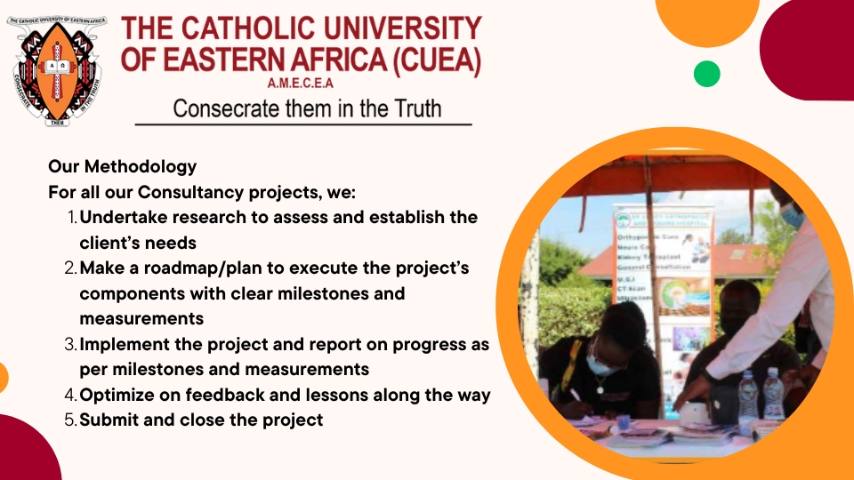 The University Consultancy wing was launched in 2013 with the aim of promoting non-tuition income of the University through training, research and Consultancy as well as enterprise services. Apart from supporting the University in its income projects, the Division has worked with church, public and private institutions in Kenya and the region in offering research, training and consultancy services with an aim of building institutional capacity.
